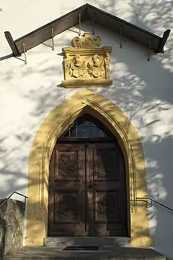 Der Saalbau mit Satteldach und einem dreigeschossigen Chorturm im Osten ist nachgotisch.[2] Der Chorturm hat eine welsche Haube. Die Fenster der Kirche sind spitzbogig mit Maßwerk.