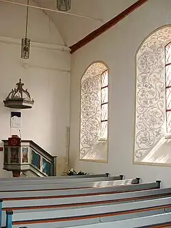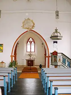Die Kirche besitzt eine hölzerne Kanzel mit Ölbildern der vier Evangelisten.