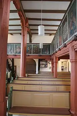 Der Innenraum wird durch eine flache Balkendecke abgeschlossen, die auf einem Unterzug ruht, der von zwei achteckigen Holzpfosten mit Kopfbändern gestützt wird. Die Balkenköpfe der Querbalken ragen nach draußen. In die Kirche wurde im Süden und Osten eine hölzerne Winkelempore eingebaut, die von achteckigen Pfosten getragen wird, die an der Ostseite Kopfbänder haben. In Bernsfeld war eine dreiseitige Empore eingebaut, die eine Orgelempore einschloss. Die Brüstungen sind mit 18 Bildern von Luther, Christus, den vier Evangelisten und den zwölf Aposteln bemalt, die mit der Jahreszahl 1773 bezeichnet sind.[1] Es wird vermutet, dass die Bernsfelder Kirche in diesem Jahr renoviert wurde.[16]
