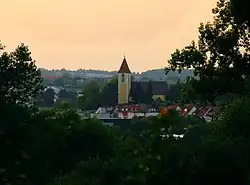 Die nach einem Brand zerstörte Saalkirche wurde 1625/26 wieder hergestellt. Sie besteht aus einem Langhaus, einem dreiseitig geschlossenen, Ende des 15. Jahrhunderts gebauten Chor im Osten, an dessen Südwand die Sakristei angebaut ist, und einem in die Südwestecke des Langhauses eingestellten, frühgotischen Kirchturm. Der ursprünglich zu einer Wehrkirche gehörende Turm wurde 1782 erneuert und beherbergt im obersten Geschoss die Turmuhr und den Glockenstuhl.