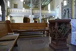 Der Innenraum des Langhauses ist mit einer Holzbalkendecke überspannt, der des Chors mit einem Spiegelgewölbe. Im 19. Jahrhundert wurden Emporen eingebaut. Die 1889 von der H. Voit & Söhne gebaute Orgel ist nicht mehr vorhanden.