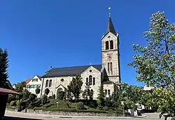 Die Hallenkirche wurde 1867/69 nach einem Entwurf von Theodor von Landauer unter dem Einfluss von Christian Friedrich von Leins aus Quadermauerwerk errichtet. Sie besteht aus einem Langhaus mit einem Mittelschiff und zwei Seitenschiffen sowie einem dreigeschossigen, mit einem Rhombendach bedeckten Kirchturm vor dem Mittelschiff im Osten. Sein oberstes Geschoss beherbergt hinter den als Biforien gestalteten Klangarkaden den Glockenstuhl. Im Geschoss darunter ist die Turmuhr untergebracht. Im Westen der Langhauswände befinden sich Risalite.