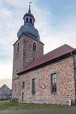 Die Saalkirche stammt aus dem 16. Jahrhundert. Nach einer Inschrift über dem Portal war 1512 der Baubeginn. Im Laufe der Jahrhunderte wurde sie erweitert. Ihre jetzige Gestalt erhielt sie im Jahr 1779. Das Kirchenschiff wurde nach Plänen von Johann Friedrich Jussow (1701–1779), dem Vater von Heinrich Christoph Jussow, nach Westen verlängert und dem Chorturm wurde eine barocke, achtseitige, schiefergedeckte Haube mit einer Laterne aufgesetzt, in dessen Glockenstuhl drei Kirchenglocken hängen.