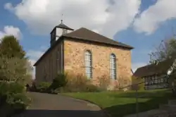 Der Vorgängerbau wurde um 1230 an derselben Stelle gebaut und 1380 erweitert. Die heutige klassizistische Saalkirche aus Bruchsteinen wurde 1822 errichtet. Die Längsseiten haben je fünf große Bogenfenster, die Westwand hat zwei. Der schiefergedeckte Dachturm im Osten schließt mit der Fassade ab. Der Innenraum hat dreiseitige Emporen.
