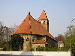 Die neue Kirche ist ein schlichter Saalbau mit halbkreisförmiger Apsis, in die fünf runde Chorfenster eingelassen sind, die die Evangelisten sowie zentral Jesus Christus zeigen. In den Neubau wurden die Untergeschosse des mittelalterlichen Kirchturms einbezogen, der zudem erhöht wurde. Die alte Turmkonstruktion erwies sich bei den Bauarbeiten als ausgesprochen robust, als die Arbeiter in die Westseite des Turms ein neues Portal stemmten.