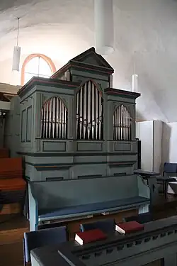 Eine erste Orgel wurde 1899 durch den Orgelbauer Heinrich Eichhorn aus Weilmünster auf die Westempore eingebaut.[13] Das seitenspielige Instrument verfügt über sieben Register, die auf einem Manual und Pedal verteilt sind. Der Prospekt hat drei Spitzbogenfelder, die durch Lisenen gegliedert werden. Das überhöhte Mittelfeld wird von einem Dreiecksgiebel bekrönt. 1953 wurde der Spieltisch erneuert. 1985 folgte eine Restaurierung der Orgel.[14]