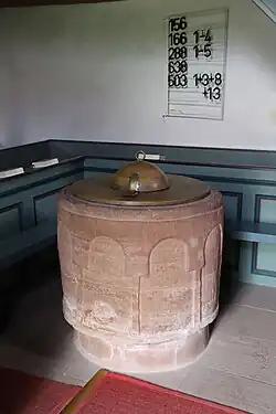 Älteste Inventarstücke sind das romanische Taufbecken mit Rundbogenfries über schmalen Lisenen und die mittelalterliche Mensaplatte auf dem Blockaltar.[6] Aus gotischer Zeit stammt eine hochrechteckige Sakramentsnische mit vergitterter Tür in der nördlichen Chorwand.[1] Östlich davon sind gotische Malereien des 14. Jahrhunderts erhalten, die Figuren in Rankenwerk zeigen, möglicherweise den Einzug in Jerusalem und die heilige Anna und Barbara.[3] Weitere Malereien im Chorraum, die aus dem 18./19. Jahrhundert stammen, stellen Engel mit Blasinstrumenten in Wolken dar.[8]