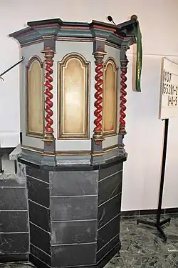 Die polygonale Kanzel steht auf einem mächtigen achtseitigen Podest an der Südseite. Nach einer Überlieferung soll sie im Jahr 1742 von einem Meister Hobbelrode aus Tirol angefertigt worden sein.[1] Der Kanzelkorb hat gedrehte, spiralförmige Ecksäulen und schließt oben und unten mit einem profilierten Gesimskranz ab. Die Kanzelfelder haben profilierte Rundbögen. Gegenüber der Kanzel steht das pokalförmige achtseitige Taufbecken. Der hölzerne Blockaltar ist über einem Podest errichtet. Das Kirchengestühl mit geschwungenen Wangen steht auf einem Dielenboden und lässt einen Mittelgang frei.