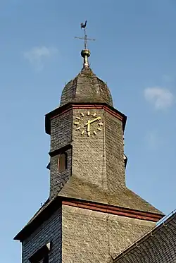 Drei große Rundbogenfenster in der Südseite und eines in der westlichen Nordseite versorgen den Innenraum mit Licht. Dem verschieferten Satteldach ist ein achtseitiger verschieferter Dachreiter aufgesetzt. Über dem kubusförmigen Schaft erhebt sich der achtseitige Helmaufbau mit den Zifferblättern der Turmuhr. Die Welsche Haube wird von einem Turmknauf, einem verzierten Kreuz und einem vergoldeten Wetterhahn bekrönt.