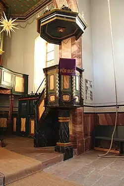 Kanzel, Altarkreuz und der große Teil des Kirchengestühls stammen aus dem Jahr 1679. Die hölzerne, polygonale Kanzel hat an den Ecken gedrehte Freisäulen. Der Kanzelkorb am Südpfeiler des Chorbogens ruht auf einem achteckigen Pfosten mit würfelförmiger Basis. Der Schalldeckel wird von vergoldeten Spitzen verziert. Das hölzerne Gestühl hat geschwungene Wangen und lässt einen Mittelgang frei. Die beiden Pfarrstühle im Chor wurden 1679 und 1905 gefertigt.[6]