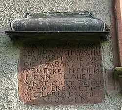 Eine überdachte Sandsteintafel am westlichen Fenster in der Nordwand trägt eine Bauinschrift: „ANNO 1665 DURCH DN LUDOWIG MARSCHAL PFARHERN WIE AUCH DIE EHRBARE KASTEN MEISTERE NEMLICH HENN LAUER UNDT CURT DEUFEL ALHIE ERBAWET IST GLORIA DEO SIT WORDEN“.[8]