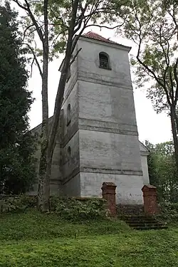 Die Kirchenruine steht auf einem Hügel im Norden des Dorfes östlich der von Borki Wielkie kommenden Hauptstraße.