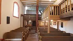 Der Innenraum wird von einer flachen Holzbalkendecke mit ockerfarben gestrichenem Längsunterzug abgeschlossen, der auf einem runden, hölzernen, rot marmorierten Mittelpfosten ruht. Die Bezeichnung mit dem Jahr 1792 auf den beiden Kopfbügen weist wahrscheinlich auf eine Erneuerung. Die zweiseitige Empore geht im ältesten, westlichen Teil auf das Jahr 1618 zurück.[11] Die Empore an der nördlichen Langseite wurde 1726 eingebaut und später verlängert. Die 27 Bilder in den Füllungen, die 1906 saniert wurden, sind nicht erhalten.[12]