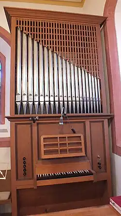 Die Kirche besaß im Jahr 1836 keine Orgel.[15] Eine erste Orgel schaffte die Gemeinde im Jahr 1862 an, die Friedrich Weller aus Wetzlar mit sieben Registern für 400 Reichsmark baute. Das Instrument tat bis zur Renovierung 1979/1981 seinen Dienst. Das heutige Instrument in der Südostecke stammt von Günter Hardt aus Möttau aus dem Jahr 1963 und wurde gebraucht übernommen. Es verfügt über sieben Register auf mechanischen Schleifladen.[16] Die Disposition lautet wie folgt:[17]
