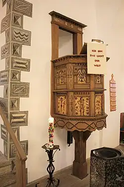 Die polygonale holzsichtige Renaissance-Kanzel stammt aus der ersten Hälfte des 17. Jahrhunderts. Sie ist an der rechten Seite des Triumphbogens aufgestellt und durch einen Durchbruch vom Chorraum zugänglich. Sie ruht auf einem viereckigen Fuß und hat auf den Kanzelfeldern Intarsien, die eine kunsthistorische Besonderheit darstellen. Vermutlich wurde sie aus einem Stollenschrank gefertigt. Teils mit Rauten verzierte Eckpfosten und Gesimse mit Zahnfriesen gliedern die Kanzelfelder in zwei Ebenen. Die Intarsienplatten der unteren Felder sind sekundär eingefügt und zeigen Jagdszenen mit Reitern, Hunden und Hirschen, eine gesichtslose Christusfigur ohne Kreuz und andere Figuren wie einen Koch, einen Pauker und einen Landsknecht mit Vogelnase. Unklar ist, ob diese Darstellungen orientalischer bzw. spanischer Herkunft sind oder sich an derartigen Vorbildern orientieren.[10]