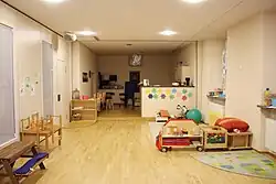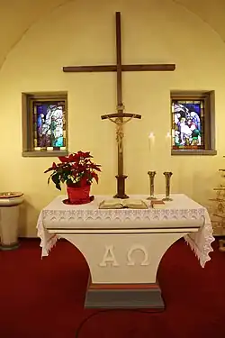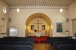 In der Ostwand der alten Kirche ist eine spätgotische Sakramentsnische mit Gittertür unter einem Kielbogen mit Maßwerk und Zinnenbekrönung aus der Zeit um 1500 eingelassen.[9] Wahrscheinlich war sie vor dem Anbau von 1937 seitlich in der Turmhalle angebracht. Das umgewidmete Schiff dient heute als Gemeinderaum und kann durch mobile Faltwände mit dem neuen Kirchenschiff verbunden werden.