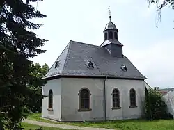 Die in etwa geostete, weiß verputzte Saalkirche auf rechteckigem Grundriss ist am östlichen Ortsrand errichtet. Der dreieckige Kirchhof wird von einer Mauer aus Bruchsteinmauerwerk eingefriedet.[8]