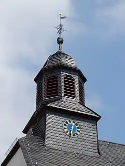 Dem verschieferten Dach sind fünf kleine Gauben aufgesetzt. Über dem Schopfwalmdach an der Westseite erhebt sich der Dachreiter. Aus dem vierseitigen Schaft, an dessen Südseite das Ziffernblatt der Turmuhr angebracht ist, leiten kleine Pultdächer zum oktogonalen Obergeschoss über, das acht rundbogige Schallöffnungen aufweist. Die Welsche Haube wird von Turmknauf, einem verzierten Kreuz, einer Wetterfahne in Gestalt eines Drachenkopfes und einem vergoldeten Wetterhahn bekrönt.