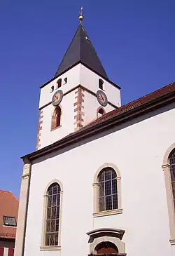 Der spätgotische Wehrturm entstand ab 1517. Das heutige Kirchenschiff wurde in den Jahren 1754 bis 1755 nach Plänen des kurfürstlichen Hofbaumeisters Franz Wilhelm Rabaliatti errichtet.
