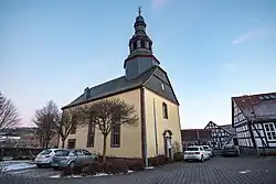 Schon 1227 gab es am Ort eine Kirche. Nachdem diese einzustürzen drohte, wurde 1755 mit dem Bau einer neuen Kirche begonnen, die am 30. Oktober 1756 eingeweiht wurde. Die verputzte und mit Ecksteinen versehene Saalkirche hat einen dreiseitigen Abschluss im Osten. Die Laibungen der Fenster und der Portale bestehen aus Sandstein. Aus dem Satteldach des Kirchenschiffs erhebt sich im Westen ein achteckiger Dachreiter, der sich verjüngt in einen Bereich mit Klangarkaden, hinter denen sich der Glockenstuhl befindet, in dem drei Kirchenglocken hängen. Zwei wurde aus der Vorgängerkirche übernommen, von denen im Zweiten Weltkrieg eine abgeliefert wurde. Die dritte Kirchenglocke wurde 1861 angeschafft, auch sie wurde im Zweiten Weltkrieg eingeschmolzen. Die verloren gegangenen Glocken wurden 1950 ersetzt. Bekrönt ist der Dachreiter mit einer Laterne. Die Kirchenausstattung stammt aus dem 18. Jahrhundert. 1760 erhielt die Kirche eine von Johann Andreas Heinemann gebaute Orgel mit 11 Registern, einem Manual und Pedal.