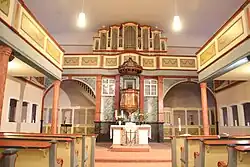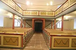 Im Westen ist eine dreiseitig umlaufende, gestaffelte Empore eingebaut, die im Bereich des Mittelgangs auf zwei hintereinander gesetzten, rotmarmoriert bemalten und vierkantig gegliederten Holzsäulen ruht, die mit Stichbögen verbunden sind.[1] An den Seiten sind die Stützen als Rundsäulen mit Kapitellen ausgeführt. Die kassettierten Füllungen der Empore haben grüne Blattgirlanden auf ockerfarbenem Hintergrund. Die zweiläufige Treppe im Westen ermöglicht den Emporenzugang. Bei den unterschiedlich gestalteten Brettdocken der Emporen- und der Kanzeltreppe stehen barocke und klassizistische Elemente nebeneinander.[18] Die Flachdecke wurde in den 1990er Jahren erneuert. Der Fußboden ist mit großen Steinplatten belegt, während das Kirchengestühl auf Holzdielen steht und einen Mittelgang freilässt. Die hellblauen, geschwungenen Wangen des Gestühls enden in Voluten.