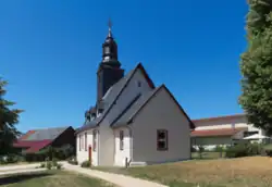 Nach dendrochronologischen Untersuchungen im Dachstuhl wurde die Bauzeit des noch bestehenden Chors auf das Jahr 1339 datiert. Es wird angenommen, dass vor 1339 der Vorgängerbau ohne Chor oder mit einer halbkreisförmigen Apsis bestanden haben könnte. Im Jahr 1764 wird das Kirchenschiff neu gestaltet. Es werden die oberen, der zweigeschossigen, dreiseitigen Emporen eingebaut, die bis in den offenen Dachboden hochgezogen sind. Aus dem Satteldach des Kirchenschiffs erhebt sich nun im Westen ein quadratischer Dachreiter, der nach einem Unwetter 1790 erneuert werden musste. Im Glockenstuhl des Dachreiters hängen drei Kirchenglocken, die vom Glockengießer Kutschbach 1764 gegossene Glocke mit 190 kg, die von der Glockengießerfamilie Bach 1789 gegossene mit 480 kg und die 1840 gegossene mit 78 kg, die im Ersten Weltkrieg abgeliefert werden musste und 1930 durch eine Glocke mit 250 kg ersetzt wurde. 1947 wurde der Altar in den Chor gerückt und die Kanzel, die bis dahin hinter dem Altar im Chor stand, in die heutige Position rechts in Höhe der 1. Empore verlegt. Das Kruzifix hinter dem Altar ist eine Arbeit von Otto Flath. Die erste Orgel mit 8 Registern, einem Manual und einem Pedal wurde 1766 vom Orgelbauer Zinck gebaut. Sie wurde 1976 durch eine Orgel mit 10 Registern von Bruno Döring ersetzt.[1]