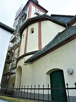 Vom heutigen Baubefund her ist nicht geklärt, ob es sich bei der Doppelapsis um die Reste eines romanischen Chorturmes handelt oder die Absicht zur Errichtung eines solchen Turmes bestand. Jedenfalls deutet die Bauausführung der Apsis zumindest darauf hin, dass vor Errichtung der Flankentürme ursprünglich ein Chorturm geplant war.