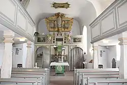 Das Innere wird von einer Spiegeldecke abgeschlossen. In das Kirchenschiff wurde 1784 eine dreiseitig umlaufende Empore eingebaut, die auf bauchigen viereckigen Pfosten ruht. Die Brüstung hat querrechteckige Füllungen. Die Kanzelwand von 1784 mit Orgelempore im Osten hat zwei Stichbogenöffnungen, links für den Treppenaufgang zur Orgelempore und zur Kanzel und rechts für die Sakristei.