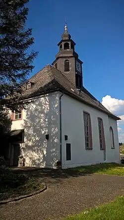 Der Saalbau wird von einem verschindelten Walmdach bedeckt und an der südlichen Langseite durch zwei hohe Fenster des 18. Jahrhunderts mit flachem Stichbogen belichtet. An der Nordseite und an der Westseite über dem Portal ist je ein kleines hochsitzendes Fenster mit flachem Stichbogen eingelassen. Der Türsturz des hochechteckigen Westportals unter einem kleinen Vordach weist auf die Renovierung von 1784 hin. Der mittelalterliche Rechteckchor ist gegenüber dem Schiff etwas eingezogen und hat an den drei Seiten je ein Rundbogenfenster. Schiff und Chor werden unter einem gemeinsamen Dach vereint.[4] Dem Walmdach ist mittig ein dreistufiger sechsseitiger Haubendachreiter aufgesetzt. An der Südseite des Schafts, der rundbogige und hochrechteckige Schallöffnungen für das Geläut aufweist, ist das Zifferblatt der Turmuhr angebracht. Über einer offenen Laterne mit rundbogigen Schallöffnungen erhebt sich die bauchige Haube, die von Turmknauf, Kreuz und Wetterhahn bekrönt wird. Die Glockenstube beherbergt ein Dreiergeläut von 1920. Die Stahlglocken wurden von Rincker als Ersatz für die 1917 abgelieferten Bronzeglocken gegossen.[18]