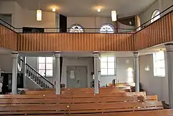 Das Innere wird durch die dreiseitig umlaufende Empore beherrscht, die bis an die Südwand reicht und von sechs achtseitigen Pfosten gestützt wird. Die Brüstung hat Profilleisten. Über eine Treppe in der Nordwestecke ist die Empore zugänglich. In der Nordostecke ist die Orgel aufgestellt.