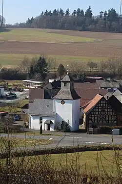 Der romanische Chorturm im Osten stammt aus der ersten Hälfte des 13. Jahrhunderts. Die Ochsenaugen im kreuzgratgewölbten Erdgeschoss des Turms wurden erst später eingebrochen. Die von Erhardt Klonk gestalteten Fenster wurden erst 1967 eingebaut. Aus dem schiefergedeckten Pyramidendach von 1776 sitzt ein Aufsatz, hinter dessen Klangarkaden sich der Glockenstuhl verbirgt.