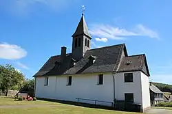 Dem verschindelten Satteldach sind an der Nordseite drei kleine Gauben und mittig ein schlanker, verschindelter Dachreiter aufgesetzt. In den quaderförmigen Schaft sind die Schallöffnungen für das Geläut eingelassen. Der vierseitige Spitzhelm wird von einem Turmknauf, einem verzierten Kreuz und einem Windrichtungsanzeiger bekrönt.