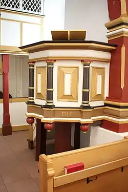 Die Kirchenausstattung wird einheitlich durch die Farben Rot, Ocker und Weiß beherrscht. Im Inneren ruht die Flachdecke auf dem runden Chorbogen in roter Fassung mit ockerfarbenen Profilen und hölzernen Wandpfeilern.[1] Durch den Bogen wird die Nordempore geführt. Die Empore ruht auf roten Holzpfosten mit ockerfarbenen Bügen und hat eine ockerfarbene Brüstung mit weißen, querrechteckigen Füllungen. Die schmale Westempore trägt in den Füllungen die Bibelverse „WO BIST DU? 1. Mose 3“ und „WO IST DEIN BRUDER? 1. Mose 4“. Die östliche Chorempore dient als Aufstellungsort für die Orgel.