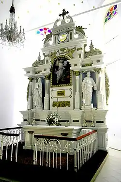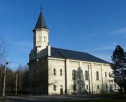 Der in den Formen des Rundbogenstils des mittleren 19. Jahrhunderts errichtete Kirchenbau ist eine in ihrer Außenarchitektur stark gegliederte Saalkirche mit polygonalem Chorschluss und einbezogenem Turm mit Oktogongeschoss und Spitzhelm, der mit einem Gewölbe und doppelten Emporen ausgestattete Kirchenraum wird von einem Altaraufbau in Neorenaissanceformen mit den Statuen von Petrus und Paulus beherrscht.