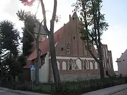 Die Kirche ist ein breiter, ohne Chor angelegter Backsteinbau auf einem Feldsteinsockel.[2] Der Turm besteht aus drei Stockwerken und hat ein geschweiftes, kuppelförmiges schindelgedecktes Dach und eine trichterartige Spitze. Die Sakristei verfügt über ein schönes Sternengewölbe. Die Vorhalle wurde nach 1750 umgebaut und erhielt eine innere Tür mit Schnitzwerk von 1773.[1]
