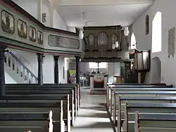 Die Brüstungsbilder von Daniel Hisgen an der Westempore zeigen die Darstellungen der vier Evangelisten, flankiert von der Lutherrose und einem Feld für Philipp Melanchthon. An der Nordempore sind elf Apostel und Paulus zu sehen. In Höhe des Anbaus ist die Empore zurückgesetzt und wird durch ein schräges Stück, mit der Chorempore verbunden. Das Verbindungsstück hat eine Schrifttafel mit den Namen der Gefallenen im Ersten Weltkrieg. Die schlichte, hölzerne, polygonale Kanzel stammt aus der Zeit um 1800.[1] Der angegliederte Pfarrstuhl hat im oberen Teil ein durchbrochenes hölzernes Rankenwerk und wird von einem profilierten Gesimskranz abgeschlossen. Die Brüstungsfelder am Kanzelaufgang und am unteren Teil des Pfarrstuhls zeigen Malereien aus der Mitte des 18. Jahrhunderts im Stil der Chinoiserie.[4] Das hölzerne Kirchengestühl hat geschwungene Wangen und lässt einen Mittelgang frei. Der aufgemauerte Altar wird von einer roten Sandsteinplatte mit Schräge bedeckt, auf der ein hölzernes Kruzifix steht. Das oktogonale Taufbecken ist aus rotem Sandstein gefertigt.