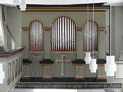 Bis 1841 hatte die Kirche keine Orgel. Johann Georg Bürgy aus Gießen reichte 1840 einen Kostenvorschlag für einen Orgelneubau mit neun Registern ein, die sich auf einem Manual und Pedal verteilten. Der Neubau kam nicht mehr zustande, da Bürgy 1841 starb. Stattdessen baute Friedrich Wilhelm Bernhard aus Romrod eine seitenspielige Orgel mit zehn Registern. Vier Pilaster gliedern den querrechteckigen Prospekt, der außen zwei schmale und in der Mitte ein breiteres Rundbogenfeld aufweist. Nach Ablieferung der zinnenen Prospektpfeifen im Jahr 1917 ersetzte Förster & Nicolaus Orgelbau 1920 die verlorenen Pfeifen. Zudem wurden zwei Register ausgetauscht. Ein Umbau nach dem Zweiten Weltkrieg veränderte die Disposition tiefgreifend. Gerald Woehl stellte 1981/1982 bei einer Restaurierung die ursprüngliche Disposition wieder her, die wie folgt lautet:[10]