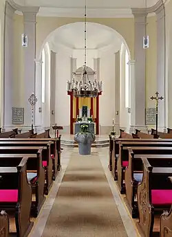 Der alte hölzerne Taufstein und der Kronleuchter wurden zwanzig Jahre später wiederentdeckt und in das Gotteshaus zurückgebracht. Allerdings hatte die Kirche inzwischen einen modernen Marmor-Taufstein erhalten, sodass der alte, achteckige Taufstein in Formen des Klassizismus einen weniger prominenten Platz im Langhaus erhielt. Der neue Altar beherrscht den Chor. Er wurde 1960 geschaffen und greift die alte Form des Kanzelaltars auf. Oberhalb eines schlichten Aufbaus bildet der Gekreuzigte den Abschluss.[4]