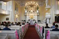 Die Gestaltung des Kircheninnenraums erinnert mit einer Doppelempore, dem Orgelaltar und der hellen Fassung an die schlesischen Bethäuser. Der monumentale viersäulige Altar im Chor ist mit gesprengtem Giebel bekrönt. Das Altargemälde aus dem 19. Jahrhundert stellt die Himmelfahrt Christi dar. Die Orgel über dem Altar stammt von der Firma Schlag & Söhne.