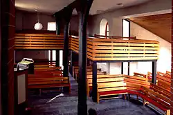 Der mittelalterliche Altar wird von einer Platte mit Weihekreuzen über Schräge bedeckt.[19] Schreiner Fritz Hornig aus Queckborn schuf 1951 nach einem Entwurf des Schweinsberger Architekten Hancke die polygonale Kanzel, die am südlichen Chorpfeiler aufgestellt ist. Sie hat kassettierte Füllungen in den Kanzelfeldern und trägt das Christusmonogramm ☧. Ein 1839/40 von Pastor Venator (Jäger) gestiftetes Kruzifix stand bis 1973 auf dem Altar und seitdem im Gemeindehaus.[21] Seit 1973 steht ein neues Kruzifix auf dem Altar und vor der vermauerten Sakristeitür ein modernes Taufbecken. Das gesamte Gestühl und die Emporen wurden in dem Jahr erneuert und der Haupteingang in den nördlichen Anbau verlegt.[22]