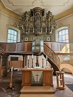 Um das Jahr 1890 wurde eine neue Orgel durch Wilhelm Ratzmann erbaut. Bei einer Renovierung der Kirche im Jahr 1934 erhielt die Orgel eine neue Fassung und das Gehäuse wurde durch einen Schnitzer ergänzt. 1967 wurde die Orgel durch Willi Peter nach einem Plan von Ernst Karl Rößler umgebaut und umintoniert. Die Orgel besitzt 14 Register.[2] Zuletzt wurde sie 1991 aufwändig durch Förster & Nikolaus Orgelbau aus Lich überarbeitet.[5]