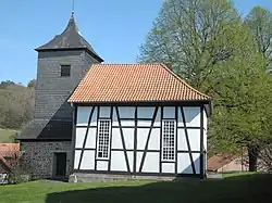 Der älteste Teil der Fachwerkkirche ist der spätgotische Chor aus Bruchsteinen, in dem mit ein Sakramentshaus aus gleicher Zeit steht. 1820 wurden das Kirchenschiff und auf dem Chor der Glockenturm aus Holzfachwerk in Ständerbauweise errichtet. Der an drei Seiten mit Schiefer verkleidete Turm ist mit einer geschwungenen, schiefergedeckten Haube bedeckt. Im Glockenstuhl hängt neben zwei, von der Glocken- und Kunstgießerei Rincker im Jahr 1953 gegossenen Kirchenglocken auch die im Zweiten Weltkrieg zwar abgelieferte, aber wieder aufgetauchte Glocke.