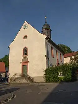 Die Saalkirche wurde 1733 erbaut. Sie besteht aus einem im Osten dreiseitig geschlossenen Langhaus, aus dessen Satteldach sich im Osten ein achteckiger, schiefergedeckter, mit einer Zwiebelhaube bedeckter Dachreiter erhebt, hinter dessen Klangarkaden sich der Glockenstuhl befindet. Zur Kirchenausstattung gehört ein Kanzelaltar aus der Bauzeit. In den Orgelprospekt der von Johann Rudolph Voit 1733 gebauten Orgel wurde 1902 von G. F. Steinmeyer & Co. die Orgel mit 9 Registern, einem Manual und einem Pedal eingebaut.[1]