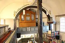 Die profilierten Bundpfosten sind innen mit Basen und Kapitellen wie Steinsäulen gestaltet.[12] Ein vierseitiger Mittelpfosten mit gefasten Ecken und reich gestalteten Kopfbändern trägt einen Längsunterzug,[13] der in den Chor hineinreicht. Ein großer runder hölzerner Triumphbogen auf zwei freistehenden Stützen, die schwarz-marmoriert bemalt sind, öffnet den Chor zum Schiff. Über dem Bogen ist der Bibelvers zu lesen: „JESUS CHRISTUS GESTERN UND HEUTE UND DERSELBE AUCH IN EWIGKEIT. HEBR.13.8“. Er wird von zwei geflügelten Engelsköpfen unter einem Blumenstrauß flankiert. Die bauzeitliche, dreiseitig umlaufende Empore hat kassettierte Füllungen, die im Bereich des Schiffs mit ornamentalem Rankenwerk (schwarz auf olivgrünem Hintergrund) verziert, im Chor aber schlicht gehalten sind. Die Ostseite mit der Kanzel ist von Emporen ausgespart.[10]