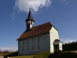 Die mit Schindeln verkleidete Fachwerkkirche wurde 1703 gebaut. 1842 wurde sie durch Blitzschlag teilweise zerstört, bis 1852 dann repariert. Aus dem Krüppelwalmdach des Kirchenschiffs erhebt sich über dem Chor im Osten ein sechseckiger, schiefergedeckter Dachreiter, der mit einem spitzen Helm bedeckt ist. Das Portal befindet sich im Westen. Der Innenraum ist mit einer Flachdecke überspannt, die mit Stuck verziert ist. Die Orgel, sie steht auf der Empore über dem Flügelaltar, wurde 1897 von Adam Eifert gebaut.