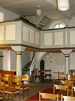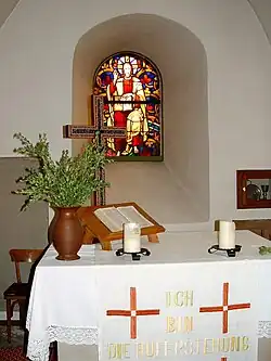 An Ausstattung aus dem 18. Jahrhundert sind eine Kanzel mit Rokokoschnitzerei und überstrichenen Evangelistenbildern, eine dreiflügelige Westempore und Grabsteine des Pfarrers Johann Sebastian Kremer (gest. 1711) und seiner beiden Töchter erhalten.[3] Im Kircheninnenraum befinden sich weiterhin Glasfenster – u. a. ein streng blickender Martin Luther.[4]