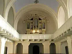 Der in der Formensprache des Rundbogenstils errichtete Kirchenbau stellt eine Wandpfeilerkirche dar, dessen Mittelschiff mit Kuppelsegmenten (sogenannten Platzlgewölben) gedeckt ist. Der Kirchenraum besitzt eine umlaufende vorkragende Galerie. Der als rundbogiges Portal gestaltete Altar enthält ein Bild des Letzten Abendmahls. Über der Orgel ist in einem Schriftband das von Martin Luther verfasste Kirchenlied Ein feste Burg ist unser Gott zitiert.