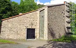 Die äußere Erscheinungsform des unverputzten, aus Sandstein errichteten Sakralbaus stellt eine Kombination der Symbole von Schiff und Burg dar.[2]