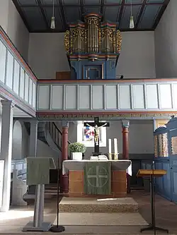 Die Orgel wurde im Jahr 1712 mit sieben oder acht Registern auf einem Manual und ohne Pedal erbaut. Als Erbauer wird aufgrund der Gehäusegestaltung ein Vertreter der Orgelbauerfamilie Grieb aus Griedel vermutet.[23] Der Prospekt ist dreiteilig: Der überhöhte, mittlere Rundturm wird von zwei Pfeifenfeldern flankiert, deren mittlere Pfeifen in einer Spitze hervortreten (so auch bei den Orgeln in Sichertshausen und Griedel). Das Schleierwerk, das die Pfeifenfelder nach oben abschließt, und die seitlichen „Orgelohren“ bestehen aus vergoldetem Akanthuswerk mit Voluten. An den vier Lisenen sind Kordeln mit Knospen und Fruchtgehängen, unterhalb der Pfeifenfelder ein durchlaufendes, profiliertes Kranzgesims angebracht. Die farbliche Fassung des Gehäuses ist blau mit einem roten Fries bei beiden Gesimsen und einzelnen vergoldeten Profilleisten. Eine geschwungene Konsole vermittelt zwischen dem schmaleren Untergehäuse und dem breiteren Oberteil. Johann Hartmann Bernhard reparierte das Werk im Jahr 1838, seine Enkel, die Gebrüder Bernhard, erneut im Jahr 1879.[24]