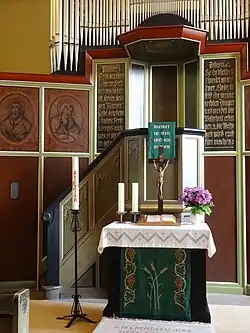Das Taufbecken, eine Zinnschale mit einem dreibeinigen Holzständer, und der hölzerne Blockaltar sind beweglich. Auf dem Altar steht ein hölzernes Kruzifix des Dreinageltypus. Das hölzerne Kirchengestühl lässt einen Mittelgang frei. Nördlich des Altars sind zwei Bänke quergestellt.